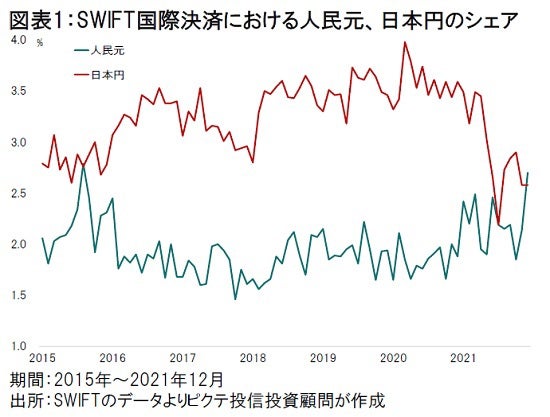 2021年1~11月における中国の通商取引額は、輸出入合計で4兆3,741億ドルに達し、米国の3兆4,121億ドルを大きく上回っている。しかしながら、SWIFTの国際決済取引を通貨別に見ると、昨年12月、米国ドルの比率は40.51%と人民元を圧倒した。2020年以降、人民元は緩やかにシェアを上げ、日本円を追い越す勢いだが、米中の格差は極めて大きい(図表1)。国際決済は依然としてドル中心なのだ。