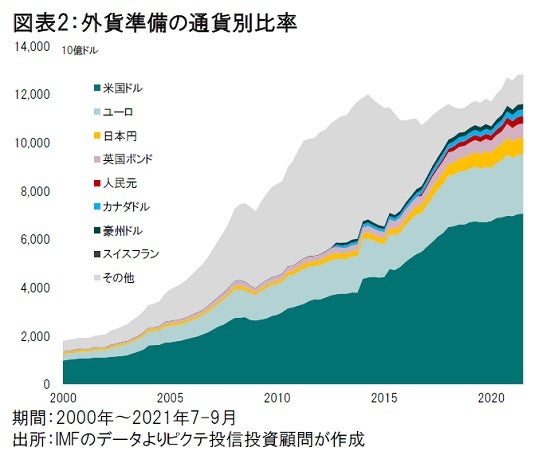 今後の注目は国際決済における人民元のシェア、そして各国による外貨準備の構成比だろう。2016年末に0.8%に過ぎなかった人民元のウェートは、昨年9月末に2.5%になった(図表2)。米国の55.1%には遠く及ばないものの、今後、急速にシェアを向上させる可能性は否定できない。