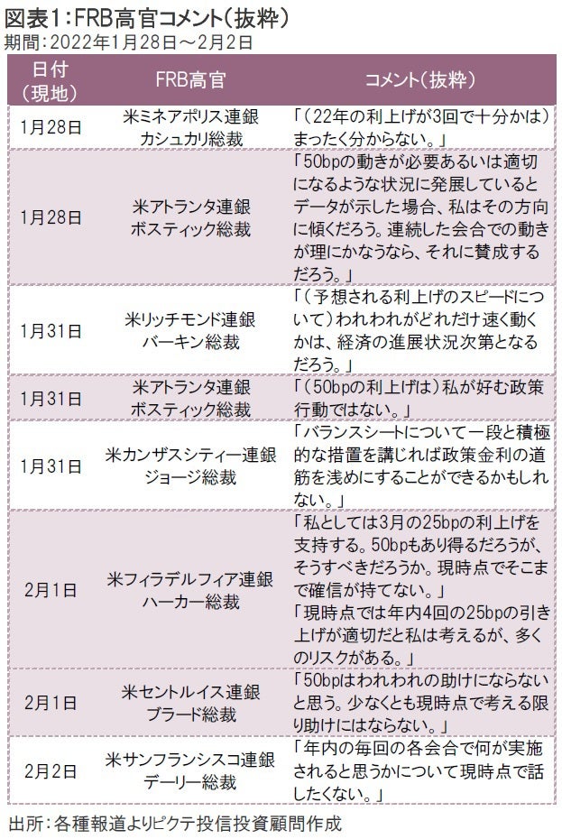 しかし、1月FOMC後に相次いで報道されたFRB高官のコメントからは、従来のタカ派メッセージよりもやや軟化した発言が目立った。米アトランタ連銀のボスティック総裁は、1月28日のメディア・インタビューに対しインフレ率が高止まりすれば50bp(ベーシス・ポイント。1bpは0.01%)の利上げを行う可能性があるとの見方を示していたが、1月31日には「(50bpの利上げは)私が好む政策行動ではない」と火消しに入った(図表1)。また、米フィラデルフィア連銀ハーカー総裁は「私としては3月の25bpの利上げを支持する」と2月1日に発言したほか、タカ派で知られる米セントルイス連銀ブラード総裁も「50bpはわれわれの助けにならないと思う」と同日にコメントするなど、急激な利上げ観測に傾く市場の見方をややけん制するコメントが相次いだ。だが、市場の利上げペース見通しに変化は無く、むしろ2月4日に発表された1月米雇用統計は、利上げペースの市場予想をさらに引き上げる結果となった。