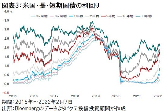今年に入ってFRBによる利上げ観測が強まり、2~5年債の金利は急上昇した(図表3)。他方、10年債以上の市況が相対的に落ち着いているのは、マネタリーベースの供給残高が依然として歴史的高水準にあるなか、利回りの高さが資金を惹き付けていることも要因と言えよう。