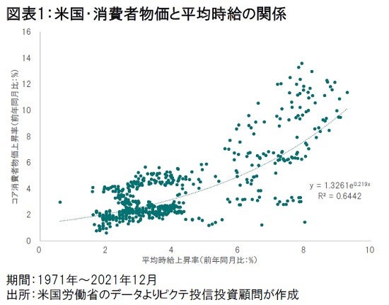 賃金の大幅な上昇はインフレ圧力に直結する。横軸に1971年以降の平均時給上昇率、縦軸にコア物価上昇率をとると、2次回帰曲線は右肩上がりだ(図表1)。決定係数(R2)が0.64なので、この曲線には統計的に見た一定の説明能力が認められる。つまり、賃上げ率とコア消費者物価上昇率には正の相関関係があり、賃上げ率が高くなれば、物価へのインパクトはより大きくなると言えるだろう。