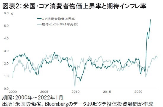 従来、期待インフレ率は12ヶ月後のコア消費者物価上昇率を概ね正確に予測してきた。しかし、現状、大きなギャップが存在しているのは、30年間に亘る物価安定期を経て、市場がインフレの定着について未だ懐疑的だからではないか。