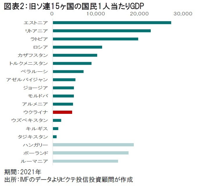 両国に共通しているのは経済の行き詰まりだ。旧ロシア15ヶ国の国民1人当たりGDPを見ると、バルト3国が最も豊かである(図表2)。また、旧親ソ東欧圏であったハンガリー、ポーランド、ルーマニアもEUとNATOへの加盟で経済を成長させてきた。一方、IMFによれば、ウクライナの1人当たりGDPは4,384ドルであり、ロシアの39%に過ぎない。ロシアにウクライナ経済を支える余力がない以上、EUへの加盟を望むのは当然であり、NATOによる安全保障を必要としているのだろう。