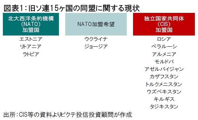 1991年12月の旧ソ連消滅後、同国を構成していた15共和国のうち、バルト3国と呼ばれるリトアニア、ラトビア、エストニアは2004年に北大西洋条約機構(NATO)及びEUに加盟した(図表1)。ウクライナとジョージア(旧グルジア)はロシアを中心とする独立国家共同体(CIS)に参加したものの、グルジアは南オセチア問題で2008年にロシアと断交、ウクライナも2014年3月のロシアによるクリミア共和国、セヴァストポリ特別市の編入を受けてCISから脱退した。両国は経済的な発展と安全保障を求めてEU、NATOへの加盟を求めている。
