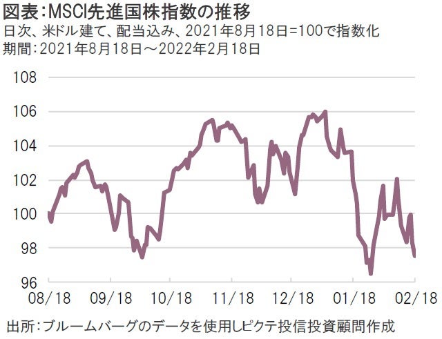 米国は2月21日(月)が「大統領の日」で3連休になることもあり、17-18日の世界株式市場ではウクライナ情勢が緊迫化する中、積極的なリスクテイク(リスクを引き上げて売買する動き)が手控えられたと推察される。