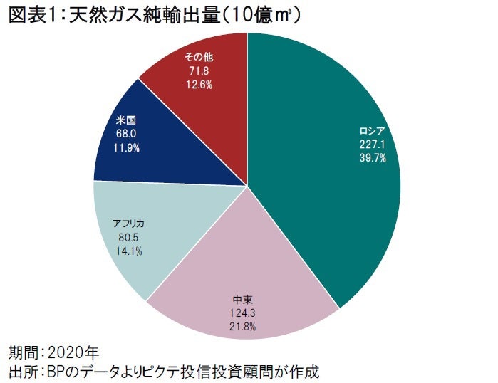 BPの統計によれば、2020年における天然ガスの純輸出量は世界全体で5,717億㎥だが、その39.7%に相当する2,271億㎥をロシアが供給していた(図表1)。特に欧州は、総需要量5,411億㎥のうち、31.0%を同国に依存している。