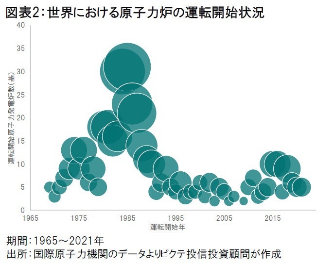 ただし、今回のウクライナ危機で日本を含めて先進国はエネルギー安全保障の重要性を再確認せざるを得ないだろう。1973~75年の第1次石油危機、1978~80年の第2次石油危機は、日米欧各国に産業構造の転換を促した。また、原子力の活用を進める契機にもなっている。国際原子力機関(IAEA)によれば、1971~2021年の間に432基の原子炉が運転を開始したが、そのうちの45.6%に相当する197基が1980年代だった(図表2)。2回の石油危機により、脱石油の代替エネルギーとして原子力が重視されたからだろう。