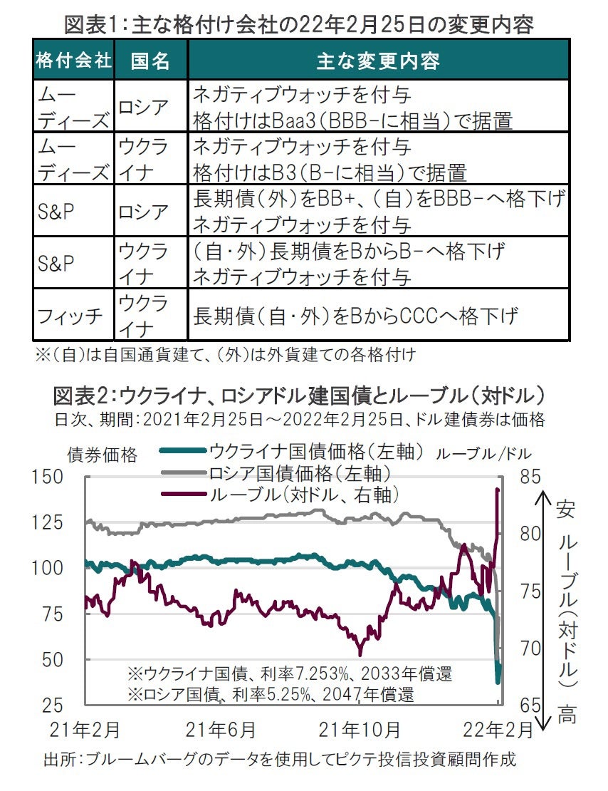 ロシアのウクライナに対する軍事侵攻を開始した翌日(2022年2月25日)、主要な格付け会社はロシアとウクライナの格下げなどを揃って発表しました(図表1参照)。