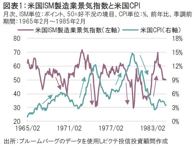 警戒すべきは景気の下振れリスクだ。1970年代前後の米国では、CPIが上昇トレンドに入ると景気先行指標として注目される米ISM製造業景気指数が時間差を伴って下降トレンド入りする傾向があり、最終的には好不況の境目である50を下回っていたことが確認できる(図表1)。つまり、CPIの絶対水準よりも方向性(インフレが加速しているか)のほうが景況感を左右しやすいと考えられる。