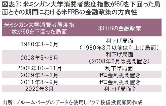 景況感の悪化リスクは企業だけではない。米国の消費者マインドを示す3月米ミシガン大学消費者態度指数(速報値)は59.7と、2月(確報値)の62.8からさらに低下した。この指数が60を下回ることはまれであり、統計開始(1978年1月)以降で計13回しか発生していない(注:3月確報値で数値が修正される可能性あり)。さらに注目すべきは米FRB(連邦準備制度理事会)の金融政策だ。過去、同指数が60を下回った局面では米FRBは緩和的な金融政策を行っていた(図表3)。逆に言えば、60を下回った局面で利上げを開始した前例は無いことになる。