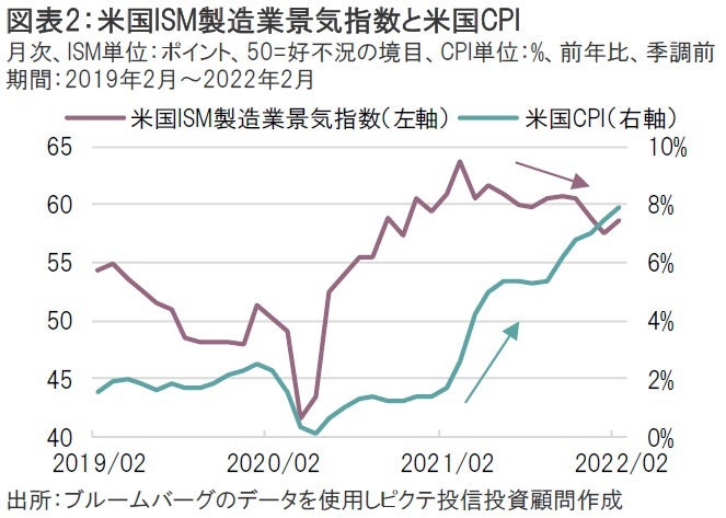 直近の両指数の動きをみると、米国CPIの上昇トレンドは加速しているものの、米国ISM製造業景気指数の下降トレンドはまだゆるやかであり、依然として50を上回っている(図表2)。1970年代前後の経験則が今回も当てはまるとすれば、今後は米国ISM製造業景気指数がさらに低下し、景気が下振れるリスクも視野に入れる必要がある。