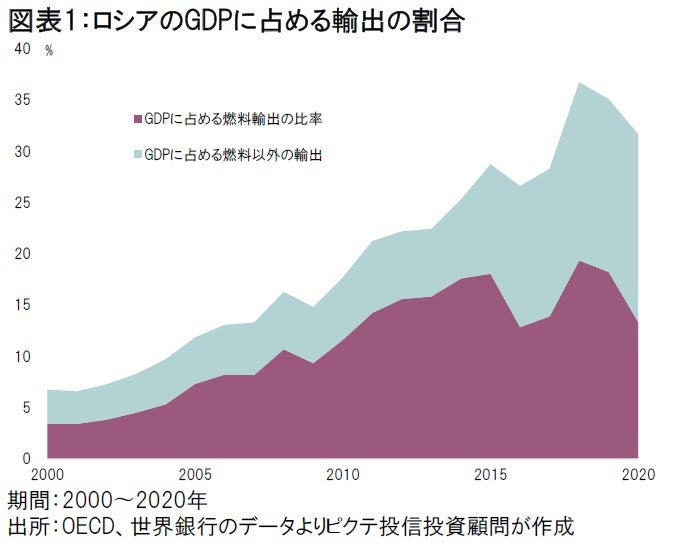 高成長を支えてきたのが天然ガス、石油など資源の輸出だ。世界銀行によれば、2020年の同国のGDPに占める輸出の比率は31.6%に達し、日本の19.1%を大きく上回る。年によりバラつきはあるが、ロシアの輸出の半分は燃料だ(図表1)。プーチン大統領の取り巻き財界人と言われる「オリガルヒ」の多くは、エネルギー関連産業の関係者に他ならない。