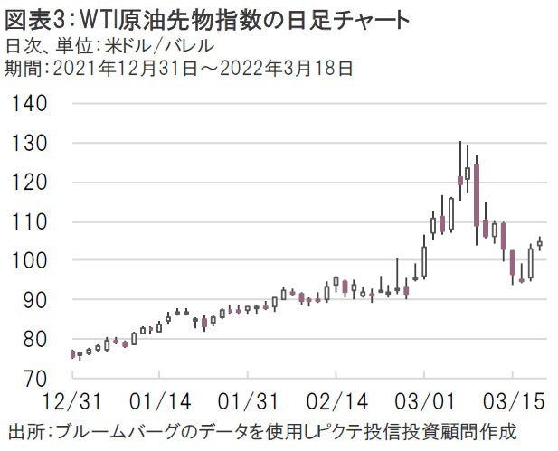 しかし、FRBは23年と24年に中立金利よりも高い水準まで利上げを行い、景気よりもインフレ抑制を重視する姿勢をSEPにおいて示しているほか、ロシアとウクライナの停戦交渉に先行き不透明感が高まる中、足元ではWTI原油先物価格が再び上昇に転じるなど、スタグフレーション・リスクはむしろ高まっている(図表3)。