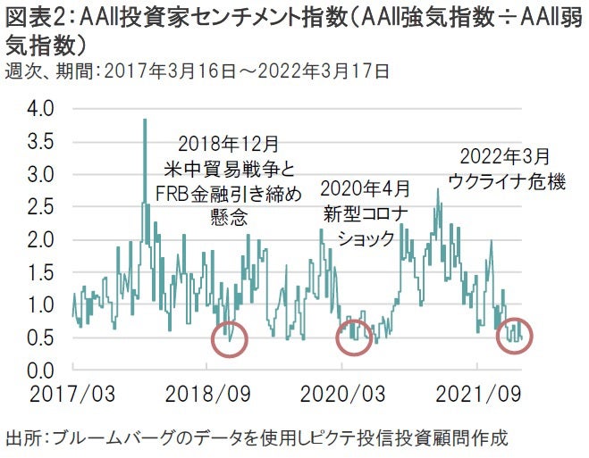 S&P500指数の急反発を支えたもうひとつの要因としては、悲観的な投資家センチメントが挙げられる。直近の米個人投資家協会(AAII)投資家センチメント指数は、2018年12月の「米中貿易戦争とFRB金融引き締め懸念」や、2020年4月の「新型コロナショック」と同水準まで悲観に振れていたことから、S&P500指数はポジティブな材料に反応しやすかったことが見て取れる(図表2)。