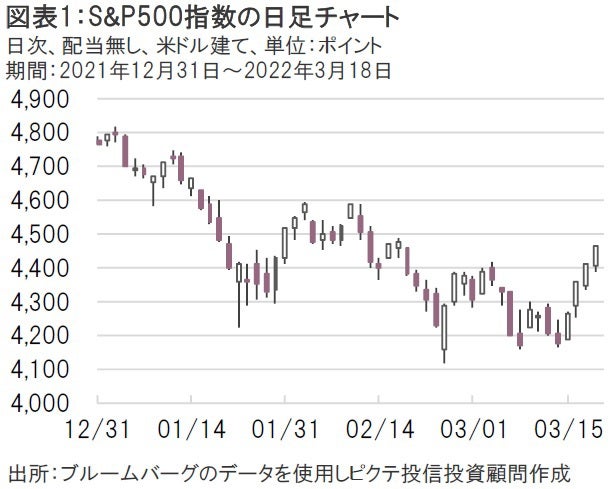 さらに、中国政府が経済成長と金融市場の安定を重視する方針を16日に示したことや、ロシアの外貨建てソブリン債のクーポン支払いが17日に無事行われたと報道されるなど、FOMC以外でも好材料が相次いだことから、3月16日以降のS&P500指数は急反発する展開となった(図表1)。