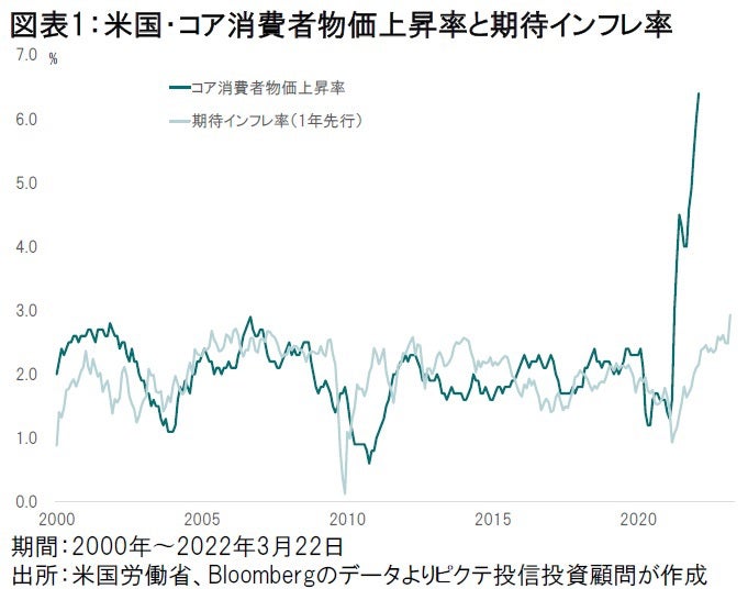 年内に行われるFOMCは、5、6、7、9、11、12月の計6回なので、今回の見通しを素直に読むのであれば、25bpずつなら毎回利上げが行われるとの含意になる。さらに、2023年についても、FFレート見通しの中央値は2.75〜3.00%とされ、計100bpの利上げが行われるとの観測が示された。