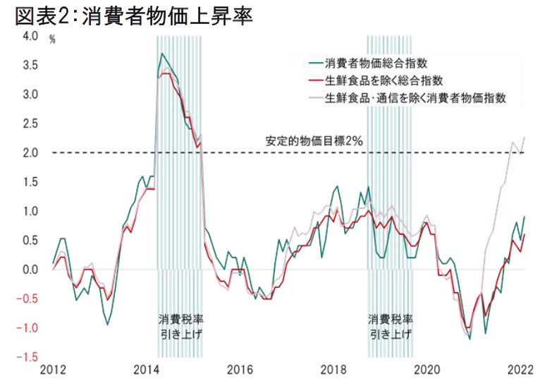 総務省が18日に発表した2月の消費者物価統計では、生鮮食品を除くコア指数は前年同月比0.6%の上昇だった(図表2)。ただし、携帯電話大手3社が昨年3月に導入した新サービスの影響を除けば、同2.3%の値上がりだ。4月以降は日銀が目標とする2%を超える可能性が高まっている。