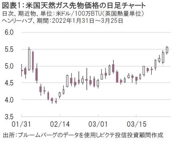 米国は2022年に少なくとも150億立方メートルの液化天然ガス(LNG)を追加供給することで欧州連合(EU)と25日に合意し、2030年まで年間500億立方メートルのLNGを追加供給する方針も掲げられた。また、欧州は2027年までにロシア産化石燃料への依存解消を図る具体策として、LNG輸入インフラの認可迅速化や、毎年11月1日の段階でエネルギーの貯蔵率90%を満たす貯蔵義務やEUによる天然ガスの共同調達、太陽光発電・風力発電の推進と水素技術の開発、室温調整機器(スマート・サーモスタット)やヒートポンプなどの省エネ技術の導入拡大などを挙げている。この合意を受けて、25日の米国天然ガス先物価格(期近物)は前日比+3.15%と続伸する展開となった(図表1)。