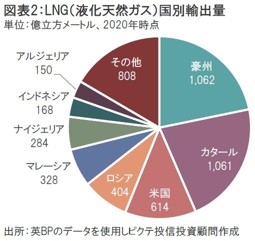 しかし、米国産LNGの増産は短期的には困難であり現実的ではない。LNGの供給を増やすには輸出する米国側と輸入するEU側で多額の設備投資を行う必要があり、数年単位の期間も要する。また、500億立方メートルの追加供給を行うには、米国LNGの輸出量を2020年対比で81%も増やさなくてはならない(図表2)。少なくとも今年の追加供給については、他国向けに供給する予定だったLNG輸出分の一部をEU向けに再配分する対応にとどまる可能性がある。さらに、2020年に欧州がロシアから輸入したLNGは172億立方メートル、天然ガス(パイプライン経由)は1677億立方メートルにもなる。仮に米国がEUに対して500億立方メートルのLNGを追加供給できたとしても、EUのロシア産輸入量(LNG+天然ガス)の27%程度しか代替することができない。
