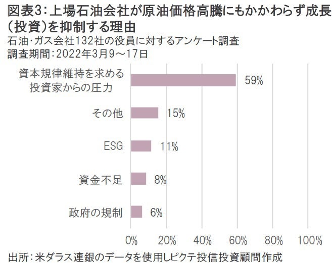 米ダラス連銀が石油・ガス会社を対象に行った最新のアンケート調査では、全体の59%が資本配分政策における規律維持を求める投資家からの圧力によって、成長投資を抑制している実態が明らかになった(図表3)。天然ガス価格が急上昇したとはいえ、それがすぐさま設備投資の増額(=供給増)という経営判断には至りにくい状況がうかがえる。天然ガス需給は当面逼迫した状態が続く可能性がある。