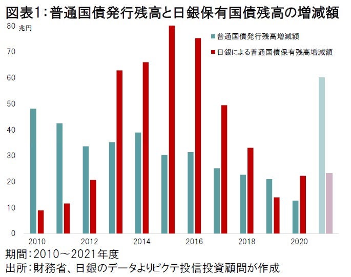 ちなみに、第2次安倍政権が本格的に稼働した2013年度以降、2021年度末までの9年間、普通国債の発行残高は276兆7,794億円増加した(図表1)。一方、日銀は量的緩和の一環としてこの間に保有する普通国債の残高を427兆6,730億円純増させ、長期金利を安定させてきたのである。