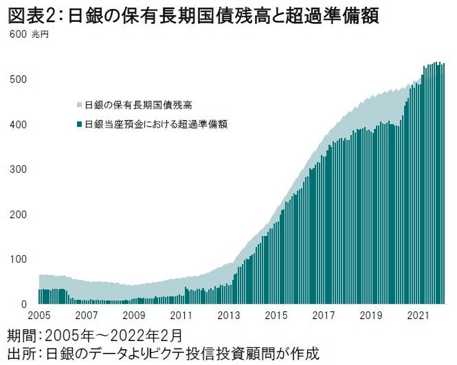 日銀が購入する国債は資産に計上され、同時に負債勘定にある当座預金の超過準備が積み上げられてきた。具体的には、2013年度に入ってから2022年2月まで、金融機関が預け入れた超過準備は416兆8,332億円増加している(図表2)。その額は、この間の日銀による長期国債の保有残高増加額とほぼ同規模に他ならない。