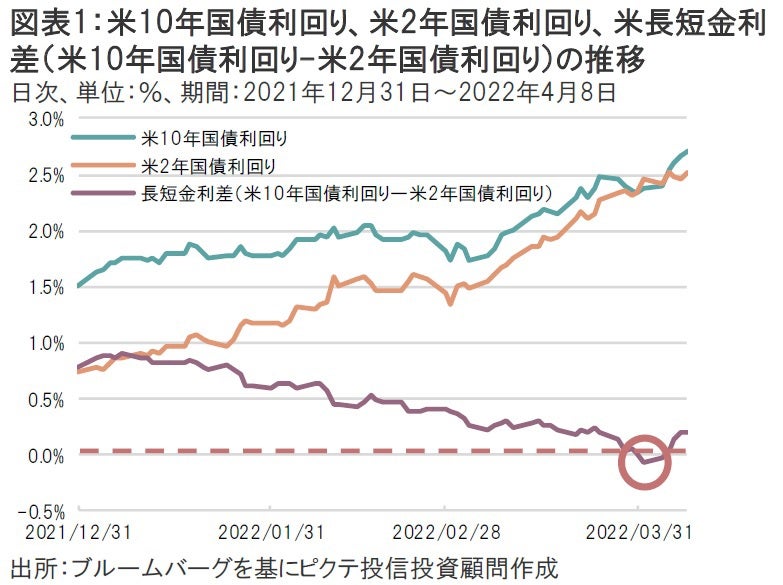 米10年国債利回りと米国2年国債利回りの差である長短金利差が4月1日に終値ベースでマイナスに転じた(図表1)。足元では、米連邦準備制度理事会(FRB)による積極的な量的引き締め観測(米10年国債需給の悪化)等が織り込まれるかたちで長短金利差は再びプラス圏まで戻ってはいるが、前回のレポートでも指摘したとおり長短金利の逆転は景気後退の予兆とも言われており軽視することはできない。