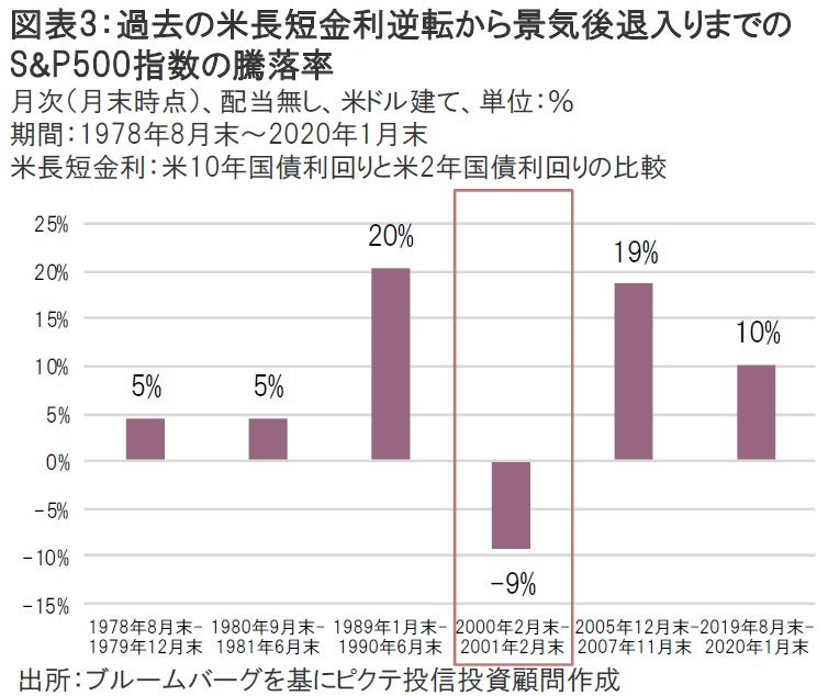 注意が必要なのは、米長短金利(米10年国債利回りー米2年国債利回り)逆転から景気後退入りまでのS&P500指数の値動きだ。なぜなら、景気後退入りした後のS&P500指数のパフォーマンスは大きく悪化するものの、米長短金利逆転から景気後退入り(直前)までのパフォーマンスは反対に上昇するケースが多いからだ(図表3)。