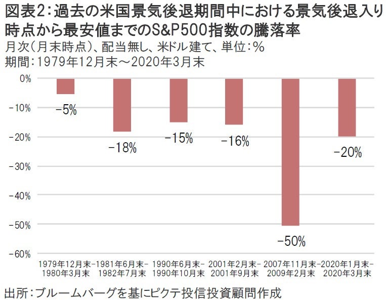 米国が景気後退入りするとS&P500指数のパフォーマンスは実際どうなるのだろうか?1980年以降で発生した米国の景気後退局面は計6回ある。これらの局面において、米国が景気後退入りしてから最安値をつけた時点までのS&P500指数の騰落率を月次ベースで計測すると、大半の期間で-10%を超える下落率となった(例外は1980年の景気後退期で約-5%)。「株式は経済を映す鏡」とも言われるが、まさに教科書通りの値動きを示していたことが分かる(図表2)。