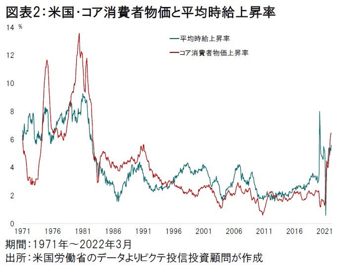 雇用の確保は事業者にとって喫緊の課題になり、賃上げ競争になっている模様だ。その結果、3月の平均時給上昇率は前年同月比5.6%の高水準になった。米国においては、労働コストは価格に転嫁される傾向が強い(図表2)。結果として、消費者物価がさらに押し上げられる循環になっている。