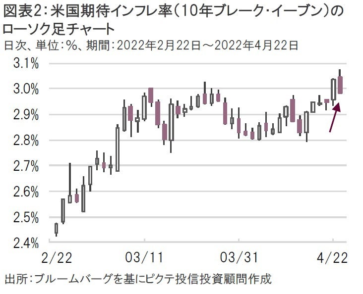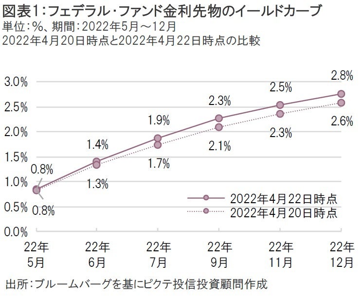 4月20日のフェデラル・ファンド(FF)金利先物のイールドカーブ上では今年12月時点のFF金利を約2.6%と織り込んでいたが、これがパウエルFRB議長発言後の4月22日には約2.8%まで上方修正された(図表1)。今年3月時点の「ドットチャート」では中立金利が2.375%と示されていたので、市場は中立金利を大幅に上回る利上げを年内見込んでいることになる。