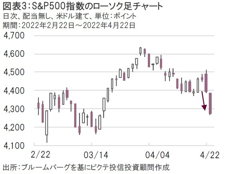 FRB当局者による度重なるタカ派発言にもかかわらず期待インフレ率が上昇した背景には、FRBの金融政策が「ビハインド・ザ・カーブ(behind the curve、後手に回った状態)」に陥っていることがいわばコンセンサス化した可能性がある。無論、FRBの量的引き締め開始を控え、米物価連動国債の需給悪化が嫌気された可能性も否定できないが、S&P500指数が4月21日から2日連続で大幅安となったことを鑑みれば、「ビハインド・ザ・カーブ」→「さらなる金融引き締め観測」→「バリュエーションの低下(株安)」と見るほうが無難だろう(図表3)。