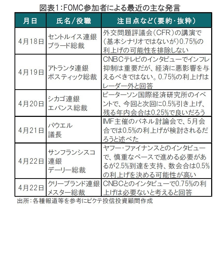 なお市場予想を見ると、ブラックアウト期間(FOMC参加者の発言停止期間、4月23日から)直前の討論会でパウエル議長が0.5%という具体的な数字に言及したこともあり、5月の利上げは0.5%が見込まれています。しかし市場は6月や7月についてはエネルギー価格動向などを受け0.75%の利上げを想定する声が増えています。ただFOMC参加者の中で0.75%の利上げ支持は少数派です。通常金融引締めを選好する傾向のメスター総裁でも0.75%の利上げに否定的です。5月のFOMCでは利上げ幅拡大の議論の内容が注目です。