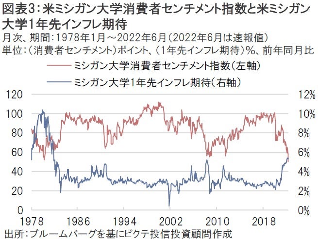 すでに米国の物価急騰は個人の消費意欲を減退させている。今年6月のミシガン大学消費者センチメント指数(速報値)は50.2と市場予想の58.1を大幅に下回り、過去最低を記録した(図表3)。このように消費マインドが大きく低迷する中で過去利上げが行われたケースは無く、米国経済の下振れリスクが高まっていることが示唆される。だが、FRBとしては物価抑制を重視せざるを得ないジレンマに陥っており、マーケットからの「信認」を得るためには、今週の米国連邦公開市場委員会(FOMC)においてタカ派メッセージをさらに強化する必要がある。株式市場の苦難は道半ばだ。