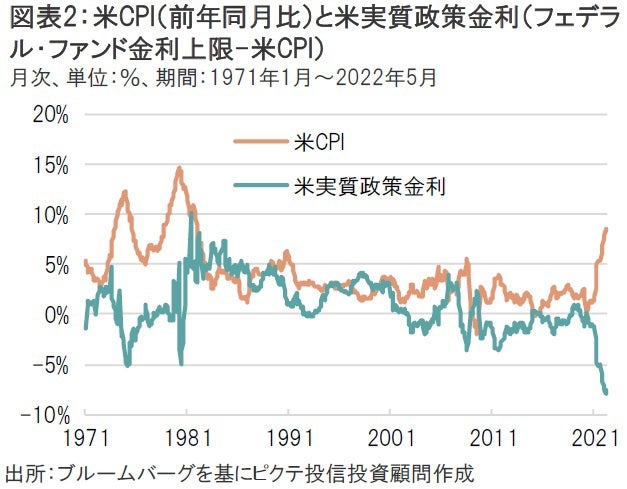 フェデラル・ファンド金利先物市場から算出した市場参加者の利上げ回数予想(1回の利上げ=0.25%)は、米国CPIの上振れを背景に6月9日から10日にかけて大きく上方修正(今年6月:2.1回→2.3回、7月:4.2回→4.6回、9月:5.9回→6.7回)されており、1回当たりの利上げ幅予想を0.5%から0.75%へ引き上げた市場参加者が幾分増えたことがうかがえる。そもそも、米国名目政策金利から米国CPIを差し引いた実質政策金利は歴史的なマイナス金利となっており、米国連邦準備制度理事会(FRB)にとってこの超緩和的な状況を是正させることが喫緊の課題となっている(図表2)。利上げペースが引き上げられたとしても、特段の違和感は無いだろう。