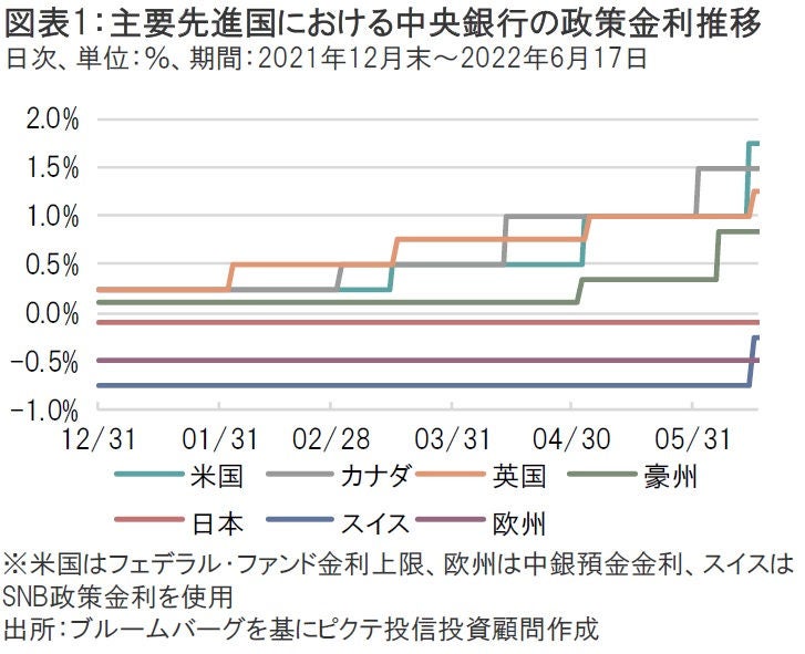 6月は主要中央銀行による利上げラッシュになった(図表1)。6月1日はカナダ銀行(BOC)が政策金利を0.5%引き上げ3会合連続の利上げを実施、7日にはオーストラリア準備銀行(RBA)が政策金利を0.5%引き上げ、2会合連続の利上げを行った。9日は欧州中央銀行(ECB)が7月に0.25%の利上げに踏み切る意向を示し、9月にはさらに利上げ幅が拡大する可能性についても言及した(ECBが予定通り利上げを行えば約11年ぶりの利上げになる)。また、15日には米国連邦準備制度理事会(FRB)が政策金利を0.75%引き上げ、前回5月に行った0.5%の引き上げから利上げペースを加速させた。さらに、翌日にはイングランド銀行(BOE)が政策金利を0.25%引き上げ5会合連続の利上げを行ったほか、市場予想に反してスイス国立銀行(SNB)も約15年ぶりとなる政策金利の引き上げを行い、利上げ幅は0.5%とした。