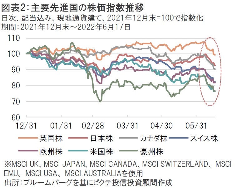 主要中央銀行(除く日銀)による相次ぐタカ派転換を受けて、株式市場も動揺を隠せないでいる。主要先進国における株価指数の推移を見ると、年初から5月にかけては英国株、日本株、カナダ株の値持ちが比較的良く、欧州株、スイス株、米国株、豪州株が軟調に推移していた。しかし、今月に入ってからはこれらの株価指数がいっせいに値を下げる展開になった(図表2)。