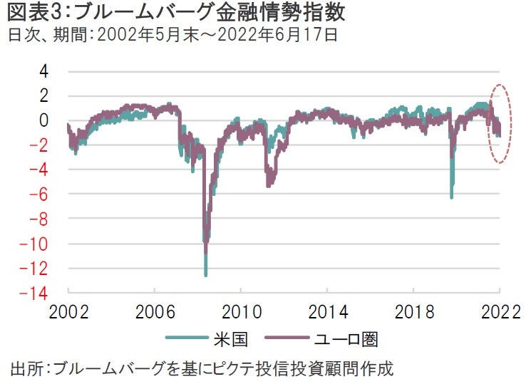 世界中で急激な金融引き締めが同時進行した結果、金融市場では金融ストレス悪化の兆候が表れている(図表3)。