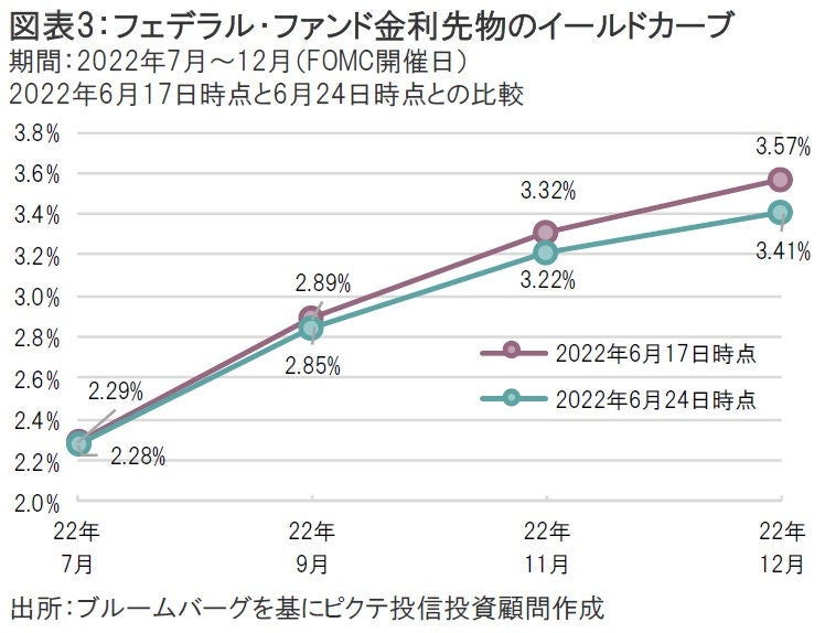 これを受けて、フェデラル・ファンド金利先物市場ではFRBの利上げ見通しが若干下方修正される展開となった(図表3)。「景気減速(後退)懸念」→「利上げペース鈍化」→「株高」というシナリオは一見すると整合性があるように見えるが、これは明らかに「ブラード総裁による景気後退観測の否定」→「株高」というシナリオと矛盾する。経済の先行きはソフトランディング(景気後退回避)かハードランディング(景気後退突入)のいずれかなので、この2つの相反するシナリオの共存は持続不可能だろう。マーケットが再び「いいとこ取り相場」の様相を呈してきたとするならば、それは相場の警告シグナルかもしれない。