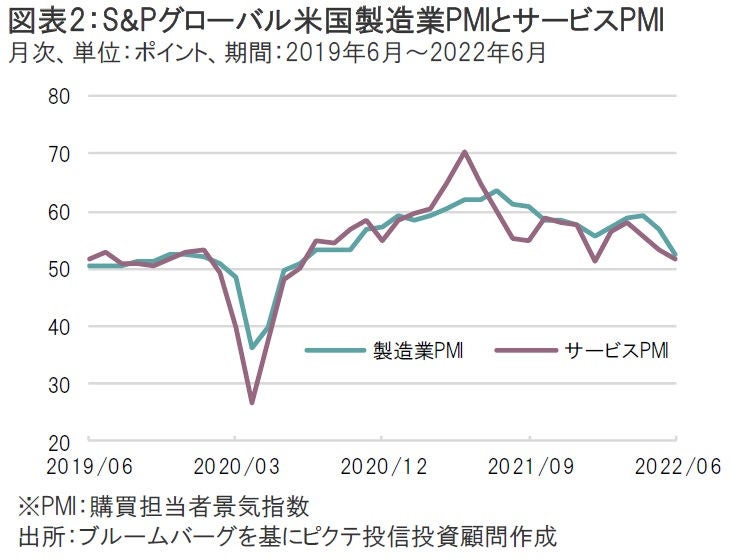 先週のS&P500指数の上昇をけん引したもうひとつの材料として、「市場予想を下回った弱い経済指標」が挙げられる。それが23日に発表された6月S&Pグローバル米国購買担当者景気指数(PMI)速報値だ(図表2)。6月米国製造業PMIと6月米国サービスPMIはともに市場予想を下回り、尚且つ前月の水準からも急低下した。