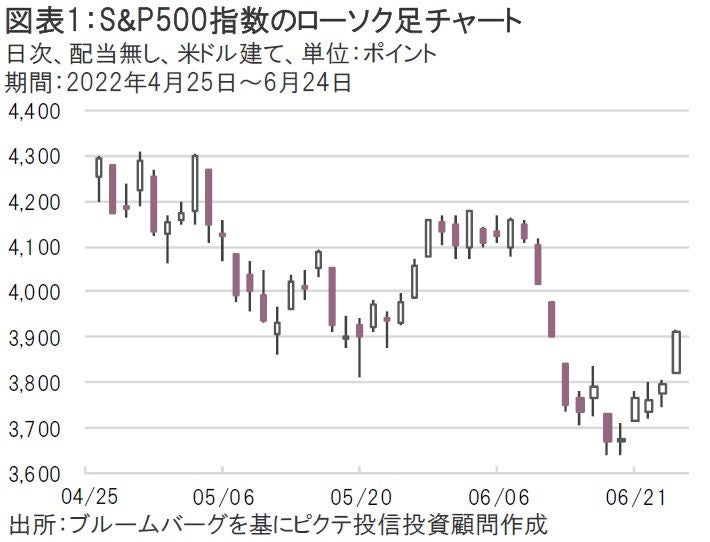 先週はセントルイス連銀ブラード総裁の発言がマーケットで注目を集めた。ブラード総裁は20日、「(1994年の引き締めサイクルが)1990年代後半における米国経済の輝かしいパフォーマンスの土台になったと考えている。今回もそのような展開を望んでいる」と述べ、マーケットでくすぶる景気後退懸念を一蹴した。さらに、24日には「米国は景気回復の初期段階にある」とし、「この段階で景気後退に逆戻りするのは通常ないだろう」とさらに踏み込んだ発言を行った。この一連の発言が米国株式市場のセンチメント改善に寄与した可能性は否めない(図表1)。