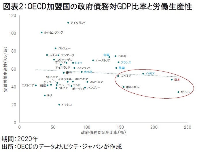 日本の財政政策と金融政策の失敗は、単に政府債務の拡大が問題なのではない。OECD加盟国のうち、2020年の政府債務対GDPが相対的に低水準の国を見ると、実質労働生産性の高い国と低い国が様々で、統計的に有意な関係を見付けることはできなかった。一方、政府債務対GDP比率が150%を超えているスペイン、ポルトガル、イタリア、日本、ギリシャの5ヶ国のなかに労働生産性が高い国はない。政府部門が肥大化すれば、経済効率が落ちるのは当然だろう。