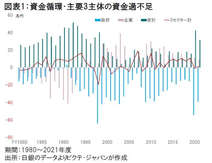 2021年度の資金循環統計によれば、家計が31兆6,562億円、企業が8兆7,301億円、計40兆3,863億円の資金余剰だった。これに対し、政府は39兆1,322億円の資金不足である(図表1)。日銀が国債を購入して供給したマネタリーベースは、財政支出により企業や家計が受け取り預金されたマネーの量に事後的に一致する。日本経済の特徴は、1998年度から企業部門が24年連続で資金余剰となり、家計と共に財政を支える姿が定着していることだろう。