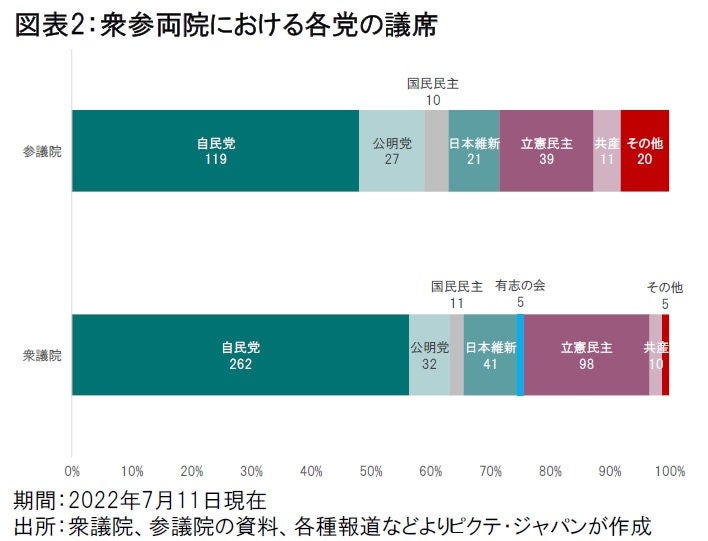 岸田首相が目指す具体的な実績が、憲法改正となる可能性は否定できない。理由は1)新型コロナとウクライナ戦争により、各種世論調査で改憲に肯定的な国民が増えていること、2)自民、公明両連立与党に改憲に積極的な日本維新の会、国民民主党を加えれば、衆参両院で改憲勢力が国会発議に必要な3分の2を超えること(図表2)、3)改憲をライフワークとした安倍元首相の遺志を継ぐことで、岸田首相は自民党内において指導力を強化でき得ること・・・の3点だ。