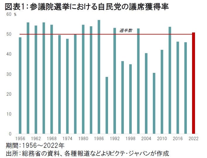 今回の参議院選挙で、自民党は改選前を7議席上回る63議席を獲得、改選過半数を単独で上回った(図表1)。過去10回の参議院選挙で、同党が改選過半数を得たのは3回に止まる。就任以来の10ヶ月間において、昨年10月の衆議院総選挙に次ぐ国政選挙での勝利により、岸田首相は政権基盤を固めたと言えるだろう。