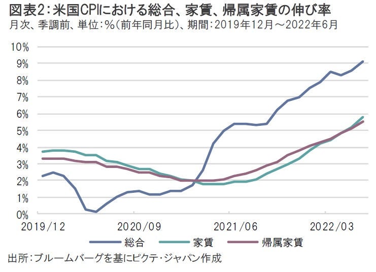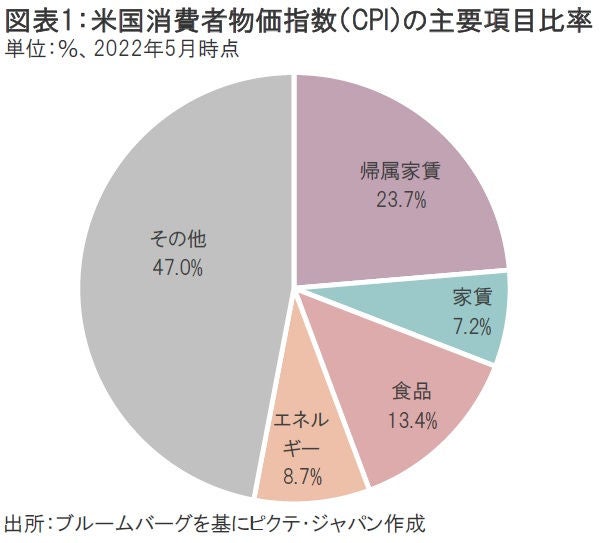 原油や天然ガス、小麦やとうもろこしなど、一部の国際商品(コモディティ)先物価格は高値からすでに下落していることから、CPIにおける「エネルギー」や「食品」の上昇率についても、いずれピークアウトすることが市場では期待されている。しかし、CPIの構成比率が「エネルギー」や「食品」よりも高い「帰属家賃」+「家賃」が目立って減速しなければ、CPIは米国連邦準備制度理事会(FRB)のインフレ目標である2%よりも高い水準で高止まりとなってしまう。