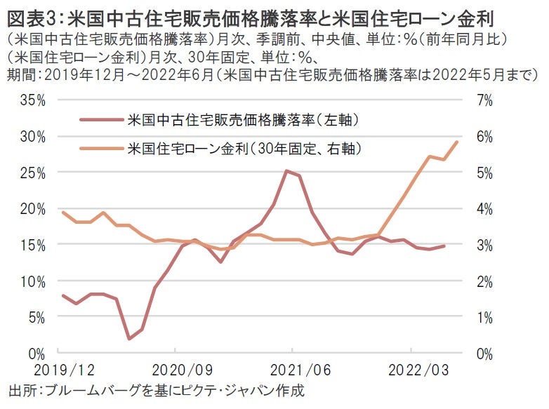米国の住宅ローン金利(30年固定)は今年に入ってから急ピッチで上昇しており、住宅ローンを借り入れるハードルがますます高くなっている(図表3)。そして、さらに追い討ちをかけているのが住宅販売価格の高騰だ。新築住宅市場よりも市場規模が大きい中古住宅市場では、中古住宅販売価格の騰落率が5月時点で前年同月比+14.8%と、引き続き2桁台の高い伸び率を示した。このため、持ち家購入を断念して賃貸を選択する人が続出したと考えられる。