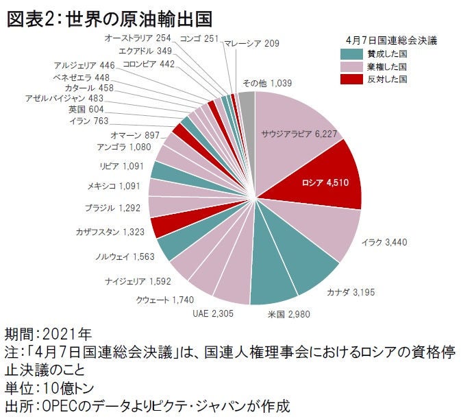 拒否権を持つロシアがウクライナへ侵攻したことにより、国連安保理は機能しなくなった。そこで、米国を中心とする西側諸国は国連総会決議を活用している。3回目となった4月7日のロシアを国連人権理事会において資格停止にする決議では、有力産油国の多くが棄権、もしくは反対した(図表2)。