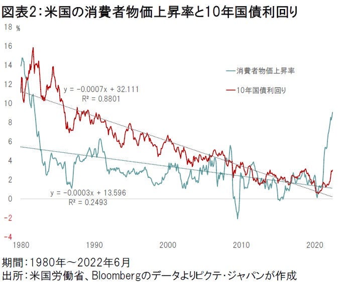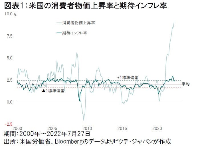 もっとも、10年国債とインフレ連動債の利回りから算出したマーケットの期待インフレ率は2.4%程度であり、2000年以降の平均的なレンジの範囲内に収まっている(図表1)。背景にあるのは、1)原油価格が現水準で推移すれば、2023年1‐3月期にはエネルギーによる物価へのインパクトがニュートラルになること、2)米国景気の減速により、需給関係の緩和が見込まれること・・・の2点があるのではないか。つまり、市場は1990年代以降の物価安定が崩れておらず、FRBが2023年中にも金融緩和に転じると予測しているようだ。