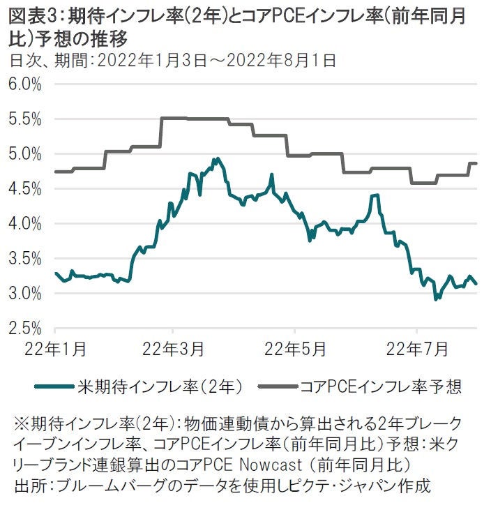 3月に利上げを開始したFRBはその後利上げペースを加速させたため、物価連動債から算出する今後2年間のインフレ率予想(期待インフレ率)は3月につけたピーク(4.93%)から低下を続け、7月には2.91%まで低下した。この水準は2021年9月に「インフレは一過性だ」といわれていた水準にほぼ匹敵する。このように大幅に低下していた期待インフレ率は、インフレの高止まりの可能性を再び織り込み始め、上昇に転じてきている。また、この期待インフレ率の動きはFOMCにおいても参考にされるクリーブランド連銀が算出しているコアPCEインフレ率予想の動きにも沿った動きとなっている。コアPCEインフレ率予想は、3月にピークをつけたあと低下し続けたが、7月にボトムをつけ再び上昇に転じてきている。